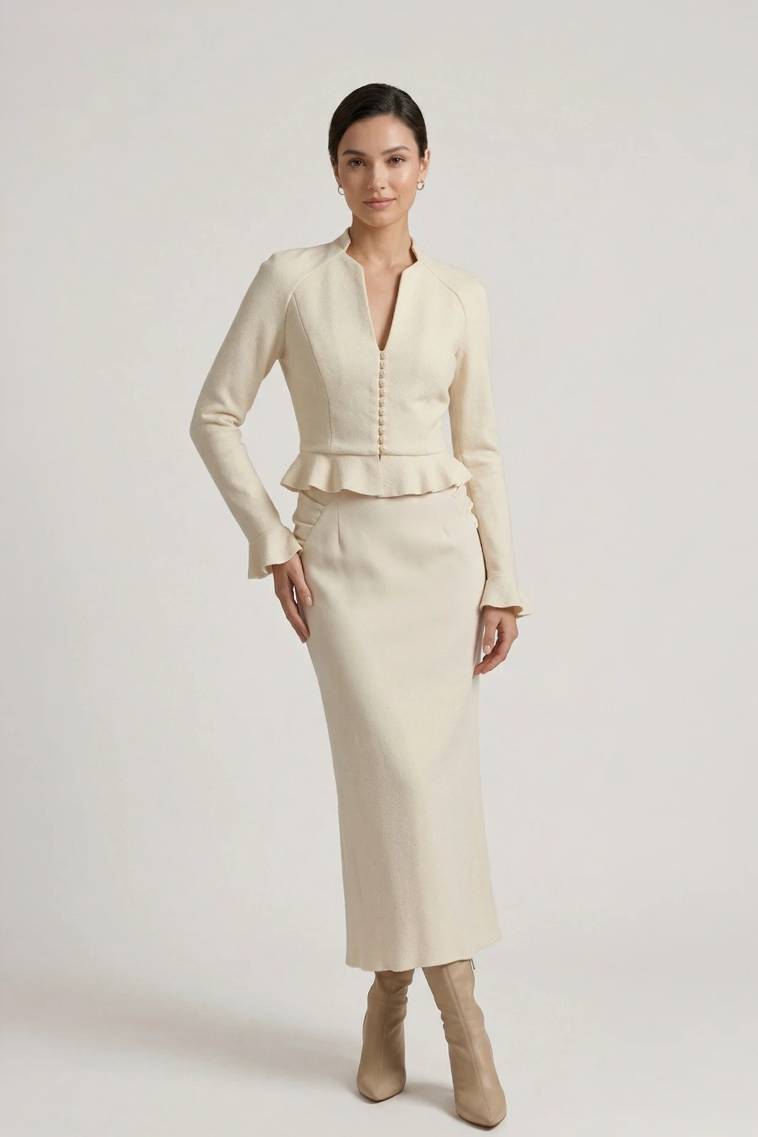 Cu designul său feminin, fusta Muse, creează un echilibru perfect între forma sa dreapta la partea de fata si croiul rafinat ce pune accent pe detaliile din sold si pe partea de spate. Aceasta se combina usor cu jacheta noastra Muse, fiind lucrata din aceeași tesatura.