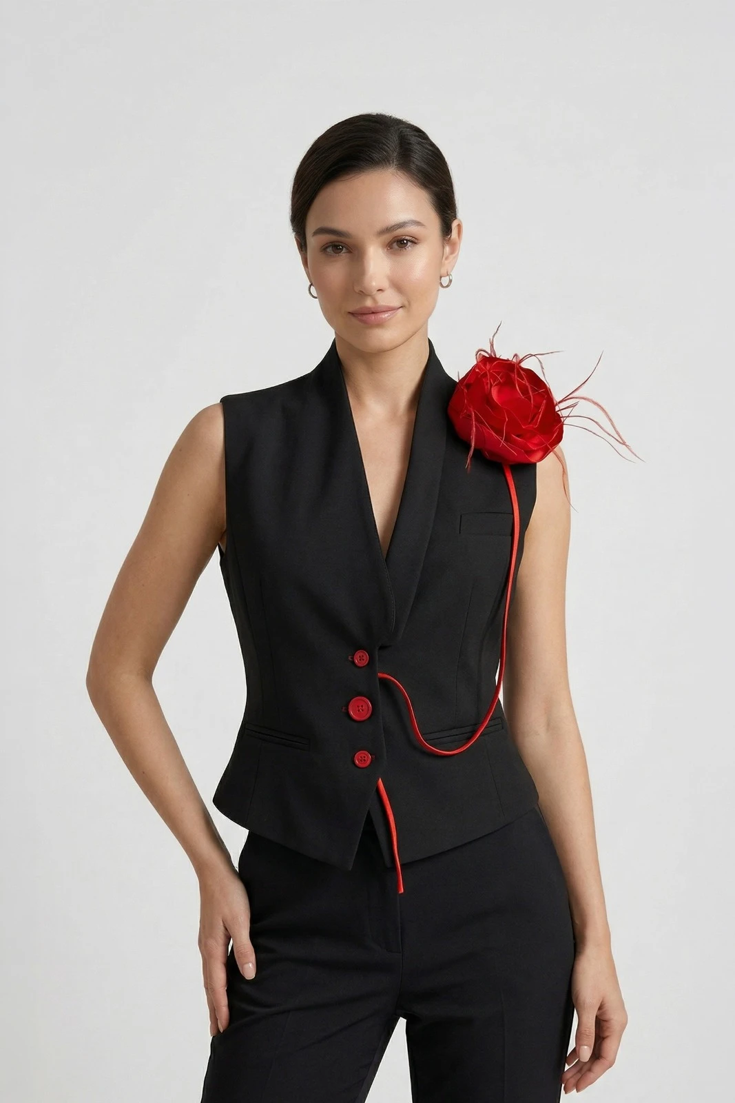 Subtil, dar distinct, vesta Celia emană eleganța unei execuții atente cu croială cambrata. De culoare neagra, prevăzută cu buzunare laterale, închidere frontală cu nasturi contrastanți și accesoriu floare in coloarea nasturilor, Celia poate fi purtata in outfituri versatile cu rochii, fuste, pantaloni sau jeans pentru lookuri elevate de zi sau de seara. Accesoriul floare este detasabil, putand fi purtat si separat, in alte combinatii vestimentare.